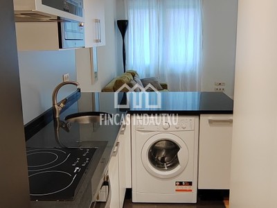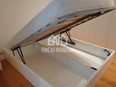 cocina americana amueblada y equipada, en perfecto estado, sala con dos ventanales a patio, dormitorio (sin ventana) con amplio armario empotrado y con la posibilidad, tal y como aparece en la fotografía, de mover dos paredes movibles y poder tener luz natural y más comodidad de acceso, cama de 1.50 con canapé, baño amplio completo con bañera.